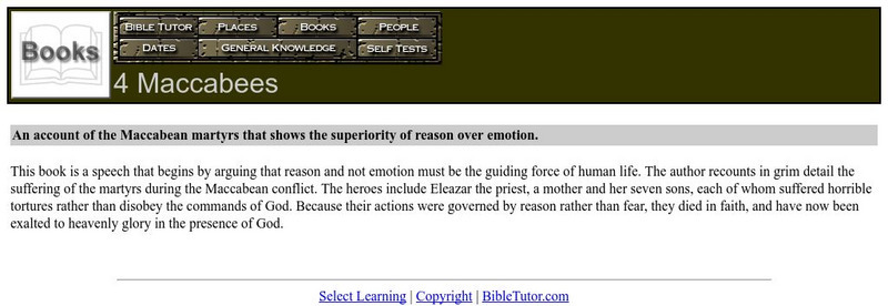 The Bible Tutor provides a brief but factual overview of the book of 4 Maccabees from the Apocrypha. The information is very short but interesting and is only one paragraph in length.