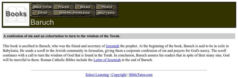 This site from The Bible Tutor provides very brief but factual information on the book of Baruch. Links are provided throughout for additional information on related subjects, and the article is only one paragraph in length.