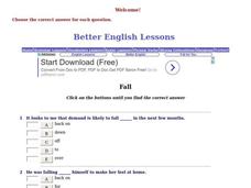 For this forms of fall worksheet, learners fill in the blanks to sentences after the form of 'fall' in the sentence. Students complete 20 multiple choice questions.