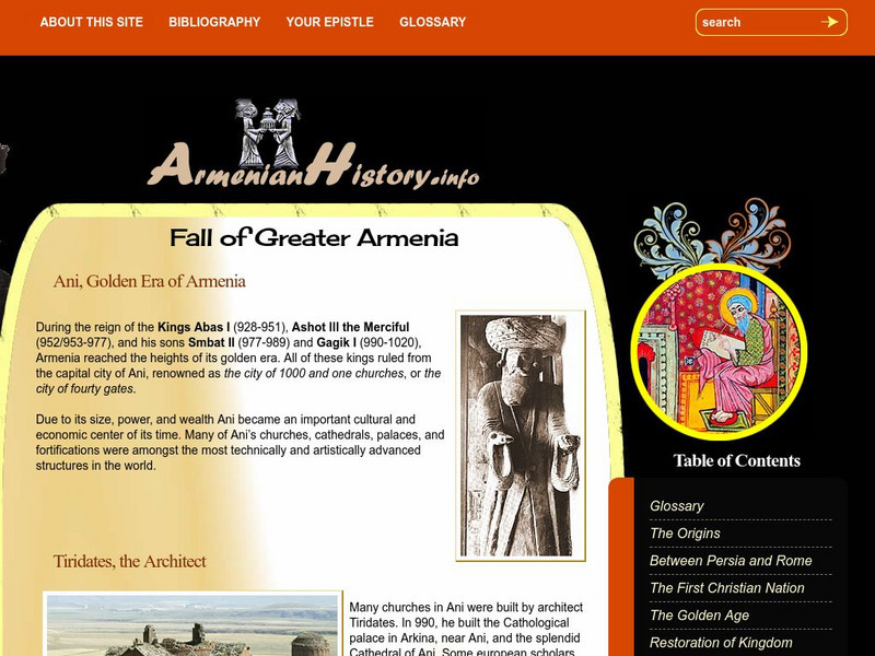 A very comprehensive look at Armenian history written by an Armenian so expect some partiality. Use the table of contents to navigate the site. Pictures illustrate every section and a glossary is included.