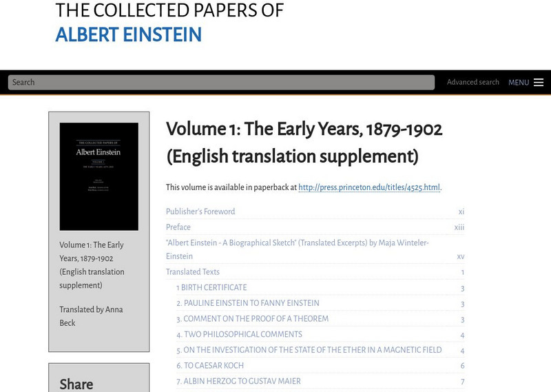 A publication of Albert Einstein's written legacy presented in English. This translated volume focuses on his life from birth to early adulthood.