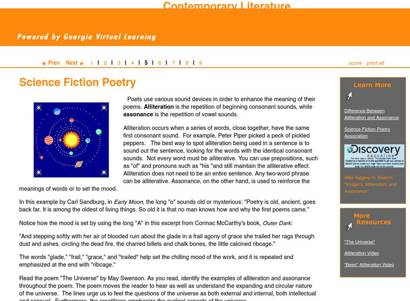 This lesson focuses on science fiction poetry and the use of the literary techniques, alliteration and assonance. It features links to two Vimeo videos on alliteration, the Science Fiction Poetry Association website, and WiseGEEK: "What...