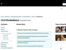 In this online interactive philosophy quiz instructional activity, students respond to 30 multiple choice questions about Thoreau's Civil Disobedience. Students may submit their answers to be scored.