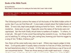 In this secondary mathematics worksheet, students find the names of all the books of the Bible hidden within the words of a story. The one page worksheet contains one problem. Answer is not provided.