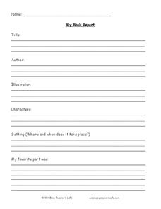 In this book report worksheet, students write the book title, author, and illustrator. Students also describe the characters, setting, and their favorite part.