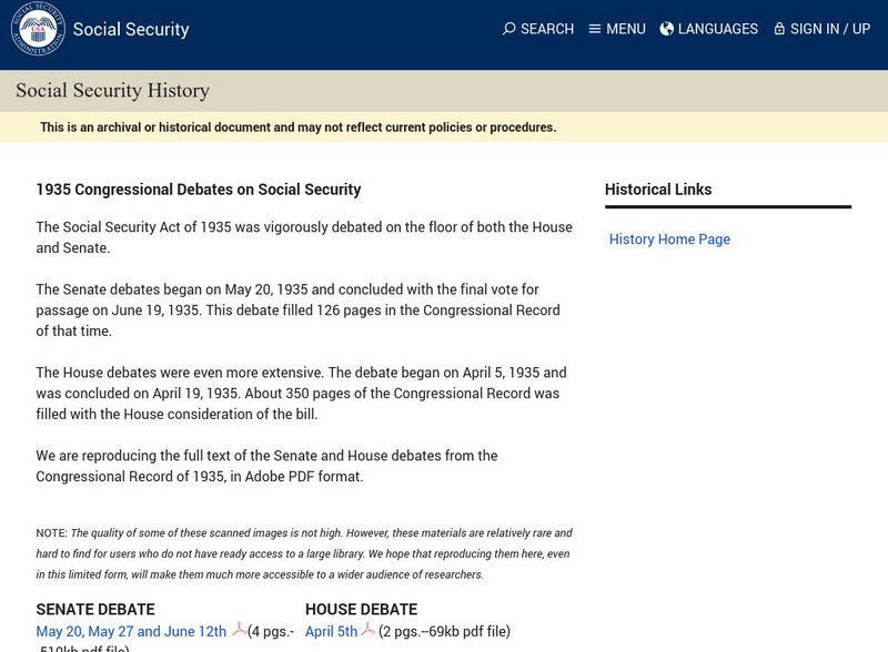 Full text of the debates in the House and the Senate over the Social Security Act of 1935, proposed by President Roosevelt for economic relief and recovery as part of his New Deal. Each of the debates can be downloaded in PDF form.