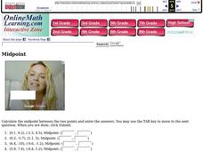 In this online math worksheet, students compute the midpoint between two sets of coordinate pairs. This excellent resource allows the students to check their answers, and to get "hints" should they run into difficulties. A terrific...