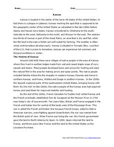 In this Kansas reading comprehension worksheet, students read a 2-page selection regarding the state and they answer 10 true or false questions pertaining to the selection.