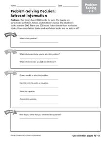 In this relevant information worksheet, learners read the word problem and then use the steps of understand, plan, solve and look back to complete the problem.