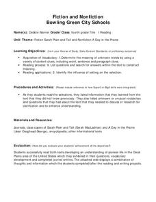 Fourth graders differentiate between fiction and nonfiction using the books "Sarah Plain and Tall" and "A Day in the Prairie." They develop a list of information that they learn from the text, and create an information web. Students...