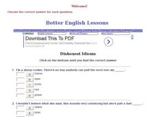 In this idiom worksheet, students compete multiple choice questions, selecting the correct word to complete a set of idioms, 20 total. Page contains links to additional activities.