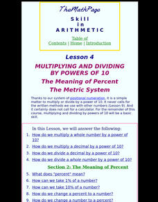 This excellent math resource explains and defines the meaning of percent. Multiplying and dividing by a power of 10 is incorporated as a preview to understanding scientific notation.