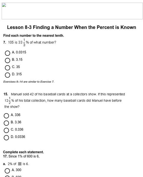 Holt, Rinehart and Winston: Homework Help Independent Practice: Finding Number When Percent Is Known