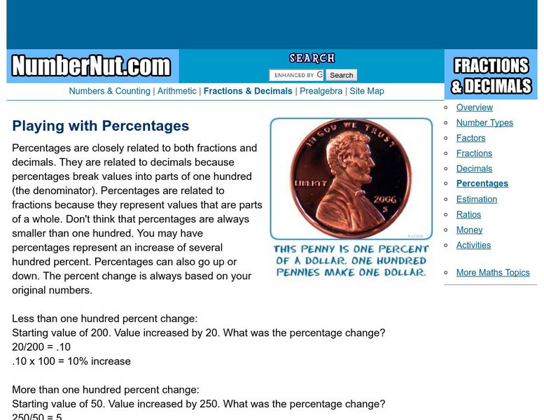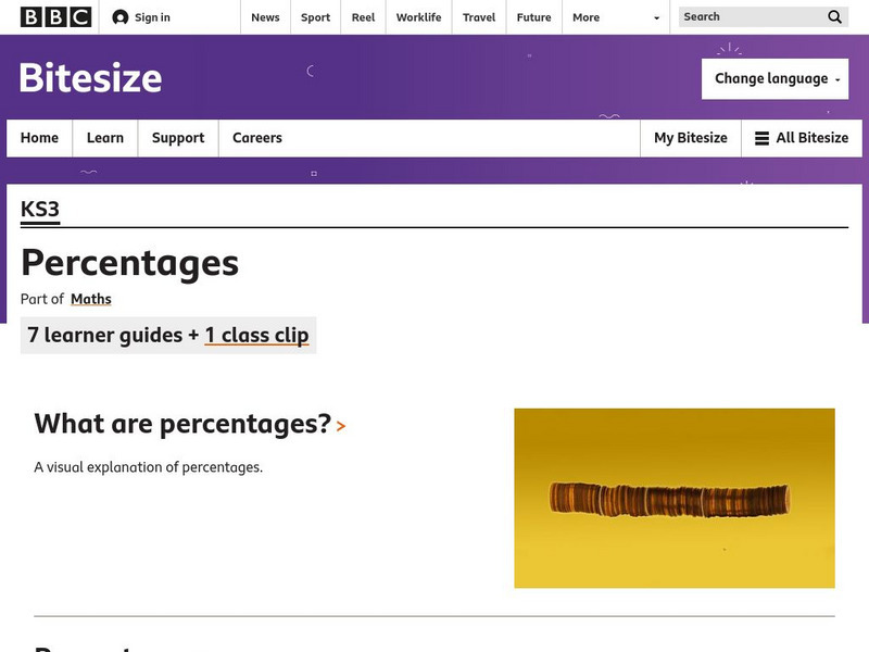 KS3 Math provides interactive activities on percentages, using pence and pounds. Use the factsheet for percentage information. You may use the worksheet for percentage practice and take the test provided to check your percentage skills....