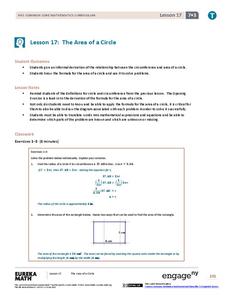 Students investigate the concept of area and how it can be applied to a circle. They use the right formula in order to solve different problems. The teacher leads the class through different examples and serves as a resource during...
