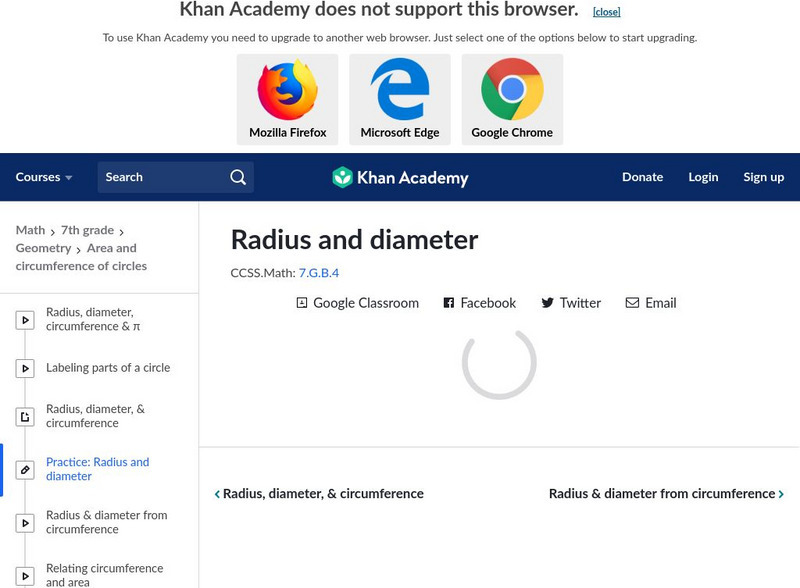 Practice finding the radius and diameter of a circle using both vocabulary and visuals. Students receive immediate feedback and have the opportunity to try questions repeatedly, watch a video or receive hints.