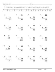 In this recognizing two-digit addition facts learning exercise, learners use a number line and addition facts to find the missing sums or addends in problems with and without regrouping. Students solve 20 problems.