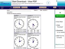 For this math skills worksheet, students solve 10 multiple choice math problems that require to identify the times on clocks. Students may view the correct answers.