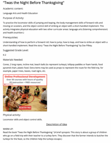 Students listen to the book, Twas the Night Before Thanksgiving. They rotate through five motor skills stations, with each station simulating an event from the book.