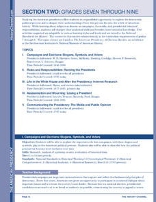 As part of a study of the American Presidency, groups investigate five topics: Campaigns and Elections, Role and Responsibilities, Life in the White House, Assassination and Mourning, and Communicating the Presidency.