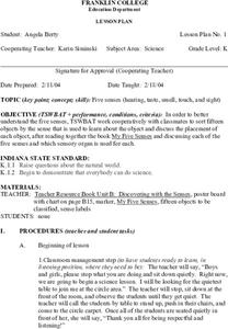 Students listen to the book "My Five Senses." They work together to classify fifteen objects by the sense that they affect. They discuss the sense organs and complete a chart. Finally, they sort mystery items from a bag which the teacher...