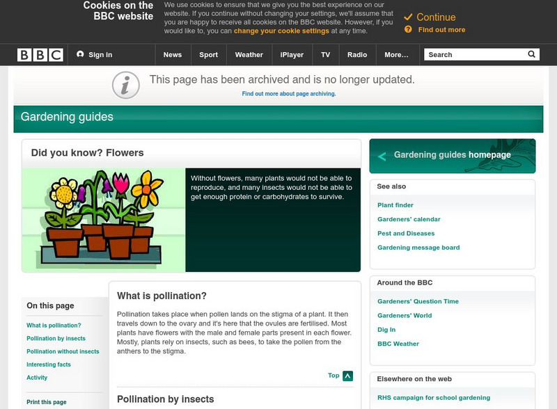 This BBC "Gardening with Children" section walks through the important process of pollination. Learn exactly what pollination is, along with pollination with and without insects. Finally, learn some unique facts about pollination and...
