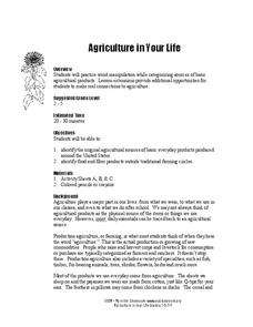 Pupils explore the origins of food and other everyday products around the United States. In this agricultural lesson plan, students learn basic vocabulary and practice matching common items with their agricultural source. They categorize...