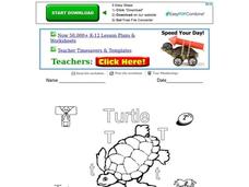In this printing letter T, students trace examples of upper and lower case letter T. Students color the word turtle and follow the directions to color upper and lower case examples of letter Tt.