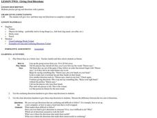Student practice giving directions. In this giving oral directions lesson plan, 2nd graders play Simon Says, identify differences between clear and unclear directions, and practice giving someone else directions in the room. Students use...