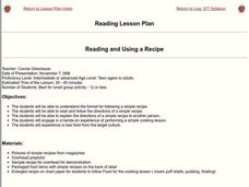 Students engage in a lesson that is concerned with the concept of cooking a new recipe. The book "Cook-a-Doodle-Doo" is used to create the context for the lesson. They use the ingredients and recipe in the lesson and work in groups in...