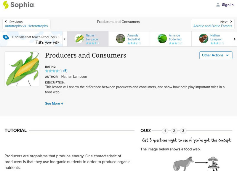 This lesson will review the difference between producers and consumers, and show how both play important roles in a food web. It is 3 of 4 in the series titled "Producers and Consumers."