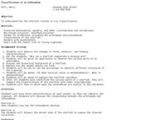 Young scholars study starfish through dissection. In this biology lesson plan, students explore the lives of starfish as they view a slide show, observe parts of echinoderms, and compare the classification of the starfish with other...