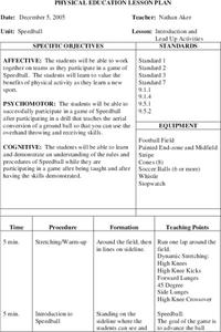 Speedball - Lesson 6 is about the assessment of skills learned by the class. They will be assessed on their performance of passing touchdowns, field goals, and drop kicks. Then the class will be divided into teams and demonstrate their...