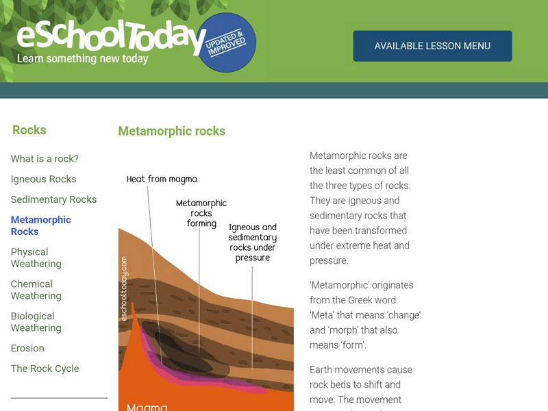 [Free Registration/Login may be required to access all resource tools.] Covers metamorphic rocks, which form from previous rocks exposed to heat and/or pressure.