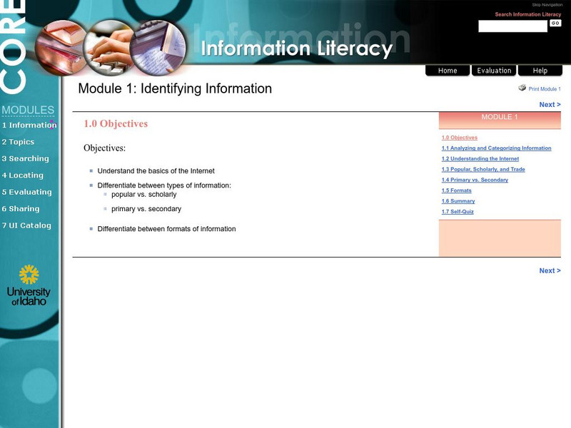 A lesson module on identifying the types of information one finds on the Internet (popular/scholarly, primary/secondary/tertiary) and the different formats information can come in. Learning exercises are embedded in the module, and a...