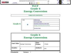 Sixth graders study energy conversions. They watch a demonstration of a working engine and make a chart explaining the energy conversions taking place. They build a simple electric motor and research other types of electric generators.