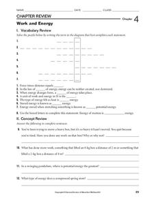 In this work and energy worksheet, students review energy laws, potential energy, and kinetic energy. This worksheet has 8 fill in the blank, 7 short answer, and 5 matching questions.