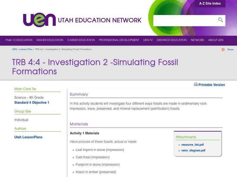 This lesson plan includes directions for 5 different activities for making a variety of fossil types. The fossils included in all five activities are casts, petrification fossils, imprints and preserved fossils. The labs require a number...