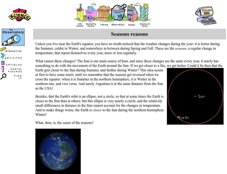 This site provides a learning activity that can be adapted for all age levels that deals with the seasons. Students are asked to become a "season sleuth" and discover what causes the seasons to change.