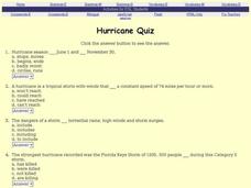 In this hurricanes quiz worksheet, students complete a ten question multiple choice on-line interactive quiz about hurricanes.
