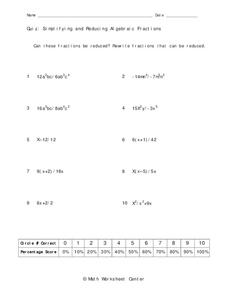 In this algebraic fractions instructional activity, 9th graders solve 10 different problems that include simplifying and reducing various algebraic fractions. First, they determine whether each of the fractions can be reduced. Then,...