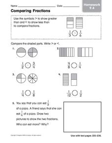 In this comparing fractions learning exercise, learners solve 5 problems in which simple fractions with unlike denominators are compared with < or >. There are pictures to clue students.