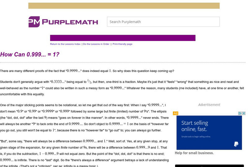 Purplemath: How Can 0.9999 = 1?