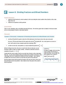 Class members discover how to extend division to fractions to mixed numbers. Individuals first review how to convert mixed numbers to improper fractions and then apply division strategies learned in previous lessons. A memory game...