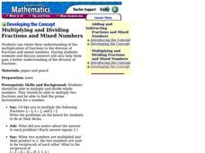 Upper graders study fraction and mixed number division and also review fraction multiplication. In this fraction and mixed numbers activity, learners work with the teacher in an oral problem solving method to multiply and divide...