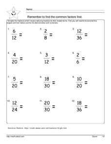 In this reducing fractions worksheet, students find the common factors to reduce fractions to their lowest terms. Students solve 12 problems.