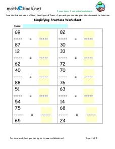 In this simplifying fractions worksheet, students simplify fractions to their lowest terms. Students simplify 10 problems total on this worksheet.