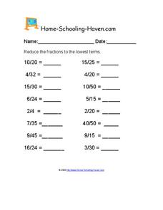 In this fraction worksheet, students reduce thirteen fraction to lowest terms. The worksheet provides an example problem worked given the procedure and showing each step.