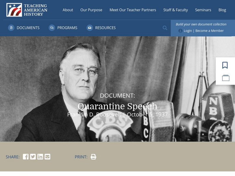 Franklin D. Roosevelt's speech to the American people pleading that the people understand and support the desperate desire for peace in the world and to isolate the country from the aggressive nations in October, 1937.