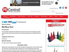 Students move safely in general space to practice transferring weight skills such as a log roll, cartwheel, forward roll, egg roll, leap over, walk over, etc.